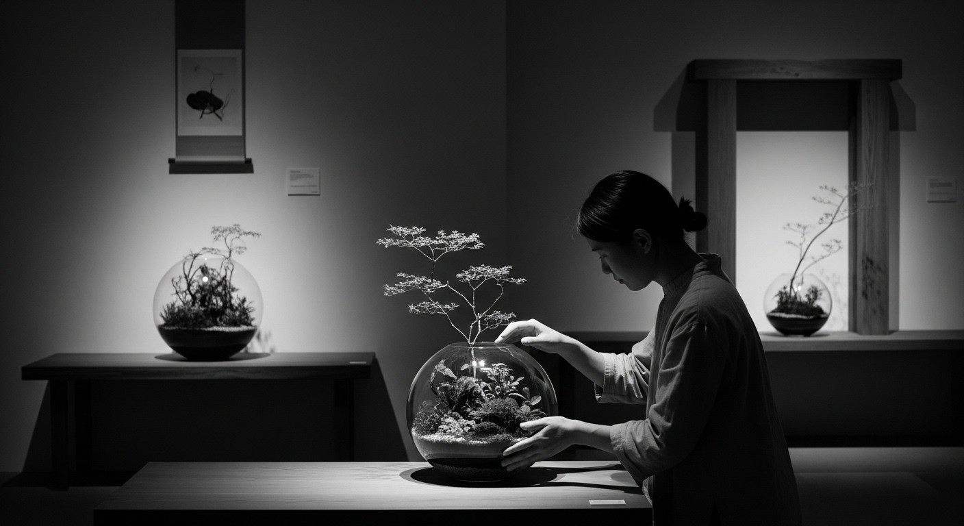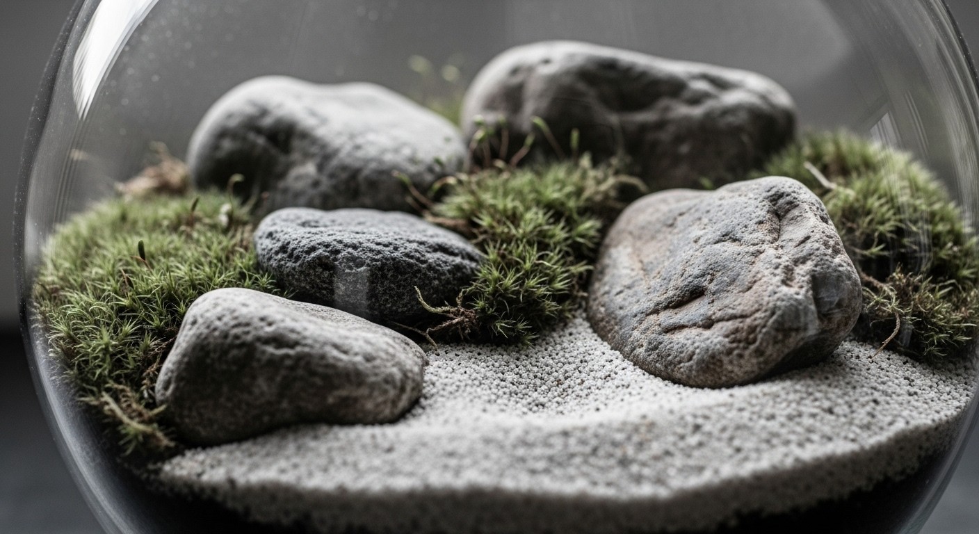 유리 돔 안에 배치된 이끼와 돌, 그리고 자갈의 조합은 한 폭의 동양화를 연상시키며